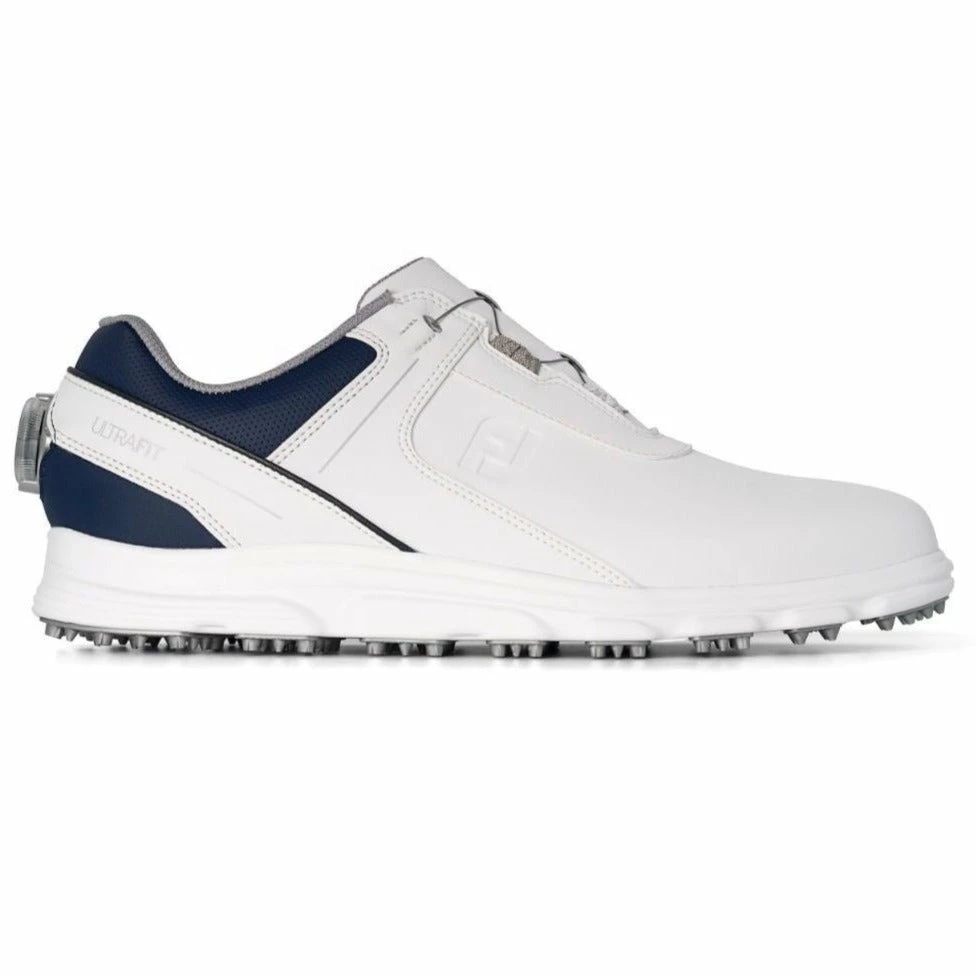 FootJoy’s UltraFit SL BOA Golf Shoes are one of the most popular models of recent years offering comfort, stability, and excellent performance on the golf course. In white and navy, the high traction spikeless design provides improved grip and stability so you will have total confidence through the swing. They are fitted with innovative BOA lacing technology and are waterproof and lightweight for superior underfoot cushioning and comfort. From the first tee to the clubhouse, FootJoy’s UltraFit BOA shoes, with their secure fit and higher level of comfort, are the ideal choice for the serious player.
